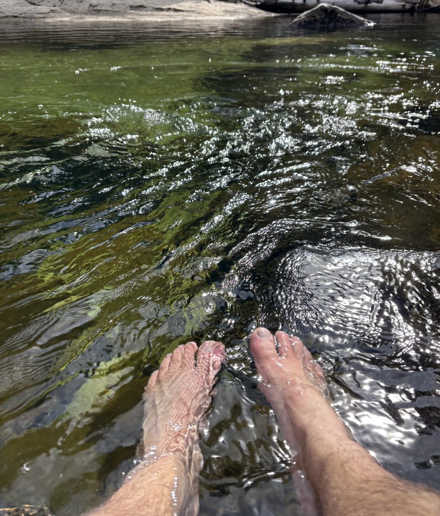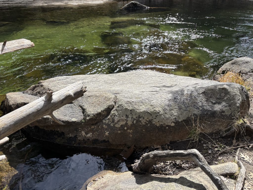 A short time after the loop crosses over Tenaya Creek, I came to a flat rock that looked perfect for a lunch stop. And the icy water next to it looked like ideal relief for my tired feet. (I already had multiple blisters, despite never getting a single one during my entire backpacking trip – same shoes, same socks. Weird!)